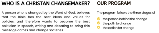 Changemaking starts within from inner values and convictions that are transitioned outwards. For this, we have designed a training that uncovers your deepest beliefs and gives you a toolbox for standing your ground with confidence. You will join a multidimensional half-of-the-year course along the best trainers, politicians, and practitioners who will introduce you to the intricate art of public speaking, debating, parliamentary speaching, resolution-writing, and media communication. You will develop a political campaign and strengthen a profile around a political topic that is related to your calling. All of this while being supported by a team of mentors and coaches. CCM will inspire, equip, and connect you to become the impactful Christian Changemaker. After finishing the program, you will know your place in politics and will have the necessary tools to take that place.